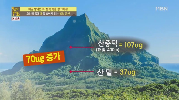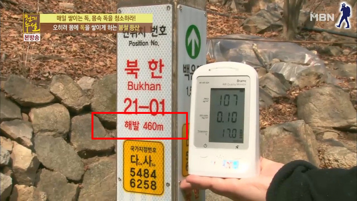 그런데 산의 중턱인 해발 460m에서 다시 측정을 해보니 무려 107라는 수치가 나왔습니다.