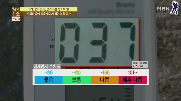 북한산 국립공원 입구에서 미세먼지측정기로 측정한 결과 37의 수치가 나왔습니다.